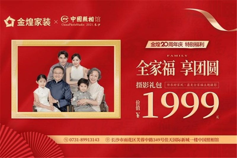 本次“全家福”摄影福利由金煌家装联合中国照相馆共同推出。中国照相馆起源于上海,繁荣于北京,2019年进驻长沙,是商务部认定的全国第一批摄影行业的"中华老字号"。历史上曾以精湛的技术为众多国家领导人提供过拍照、精修、巨幅制作等服务。