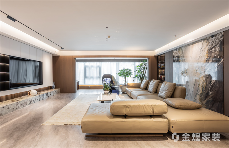 该设计以无主灯设计、岩板与木作结合,打造通透大气的现代轻奢大平层,兼具质感与生活温度。