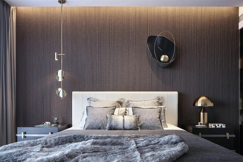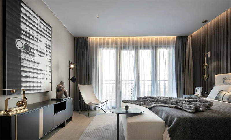卧室的设计上以简约的线条为核心元素,意式轻奢风在讲述真正的永恒经典。柔和质感灯光设计营造出豪华的感觉,搭配高档质地且色彩柔和的床品,营造出温馨而舒适的睡眠环境。