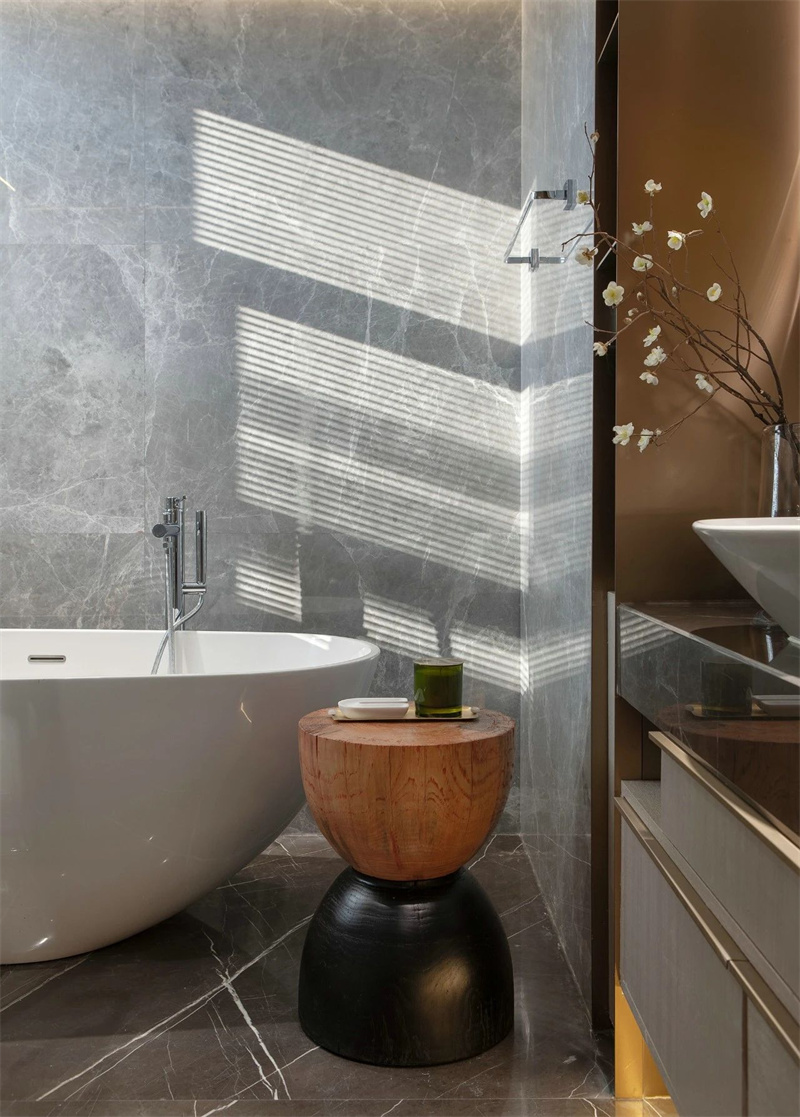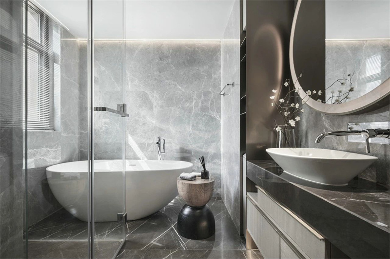 意式轻奢卫生间追求精致和典雅。大理石地板和墙面的一体化设计营造出高贵的氛围,独特的卫浴设计和华丽的浴室镜不仅为其增添了艺术元素,也为每一次洗漱体验注入了一份奢华与品味。