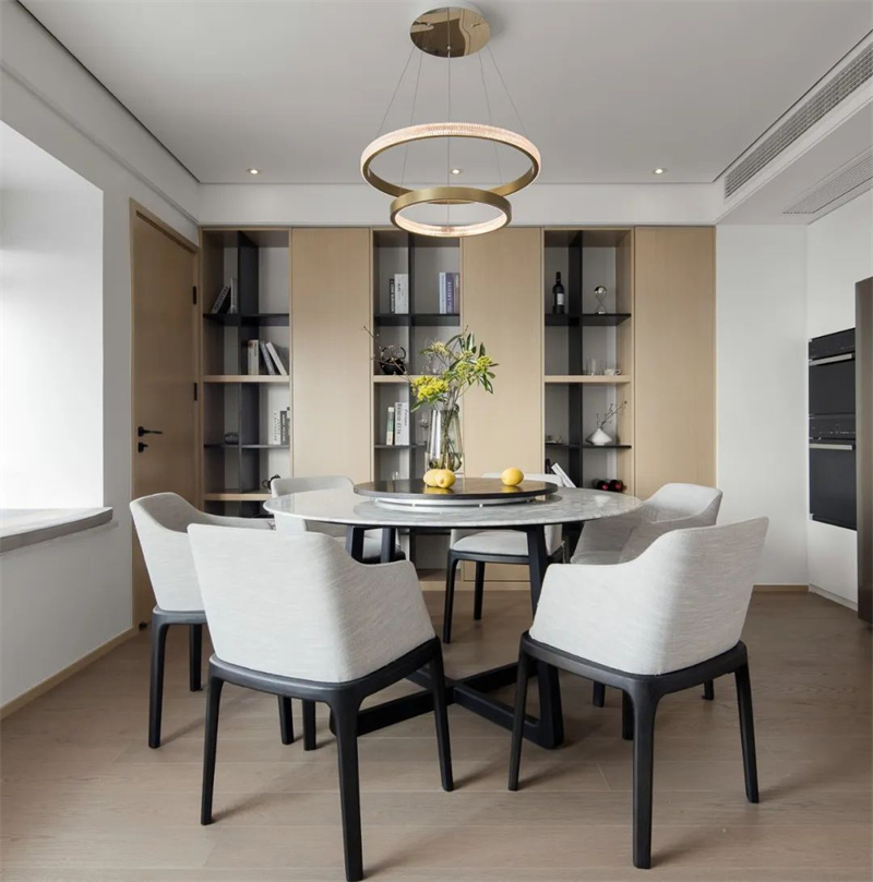 现代风格的餐厅延续整体简约基调,圆形大理石餐桌搭配灰色餐椅,质感温润又不失高级感。上方双层圆环吊灯造型独特,暖光洒落,营造出温馨的用餐氛围。一旁的墙面装饰与开放式置物架增添生活细节,功能与美感兼具。