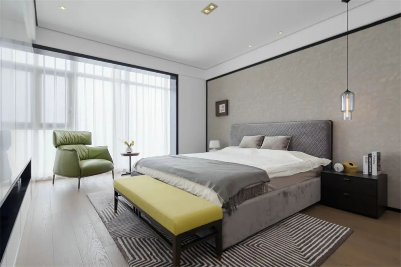 次卧以灰白为主调,搭配软包床头与木质地板,营造出安静舒适的休憩氛围。大窗采光充足,空间通透明亮。床尾亮色长凳与绿意单人椅点缀其中,为空间注入活力,整体设计简洁实用,不喧哗却有温度。