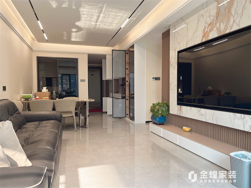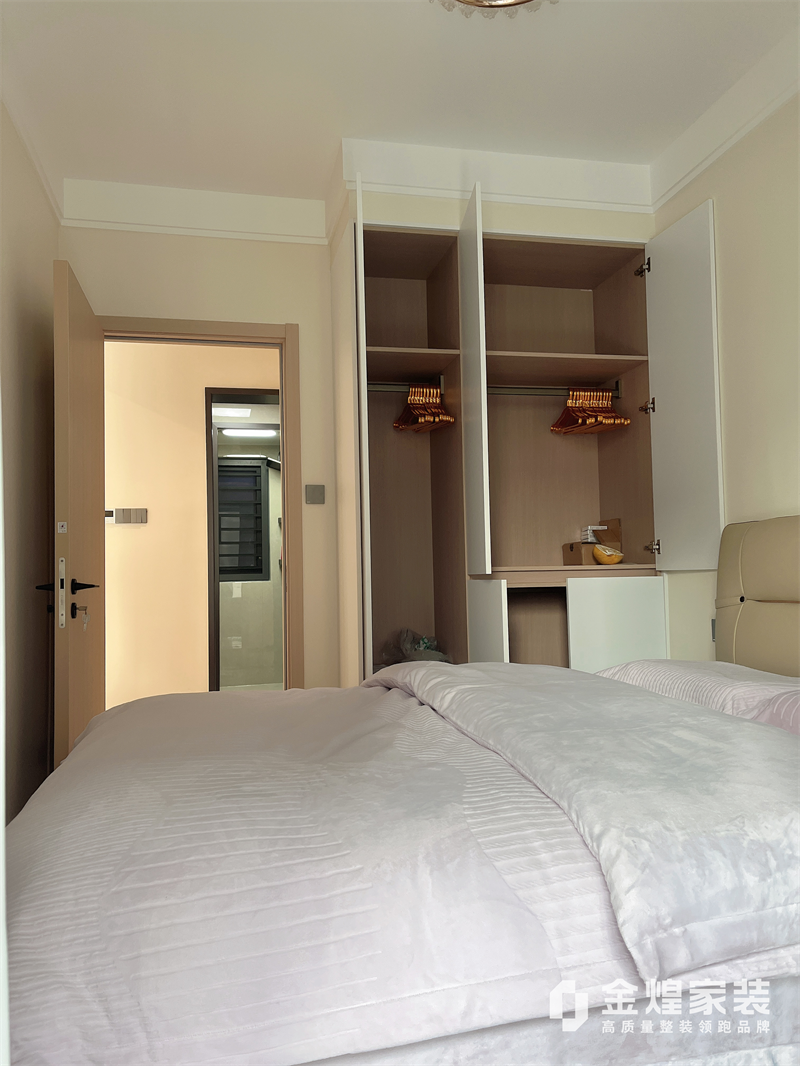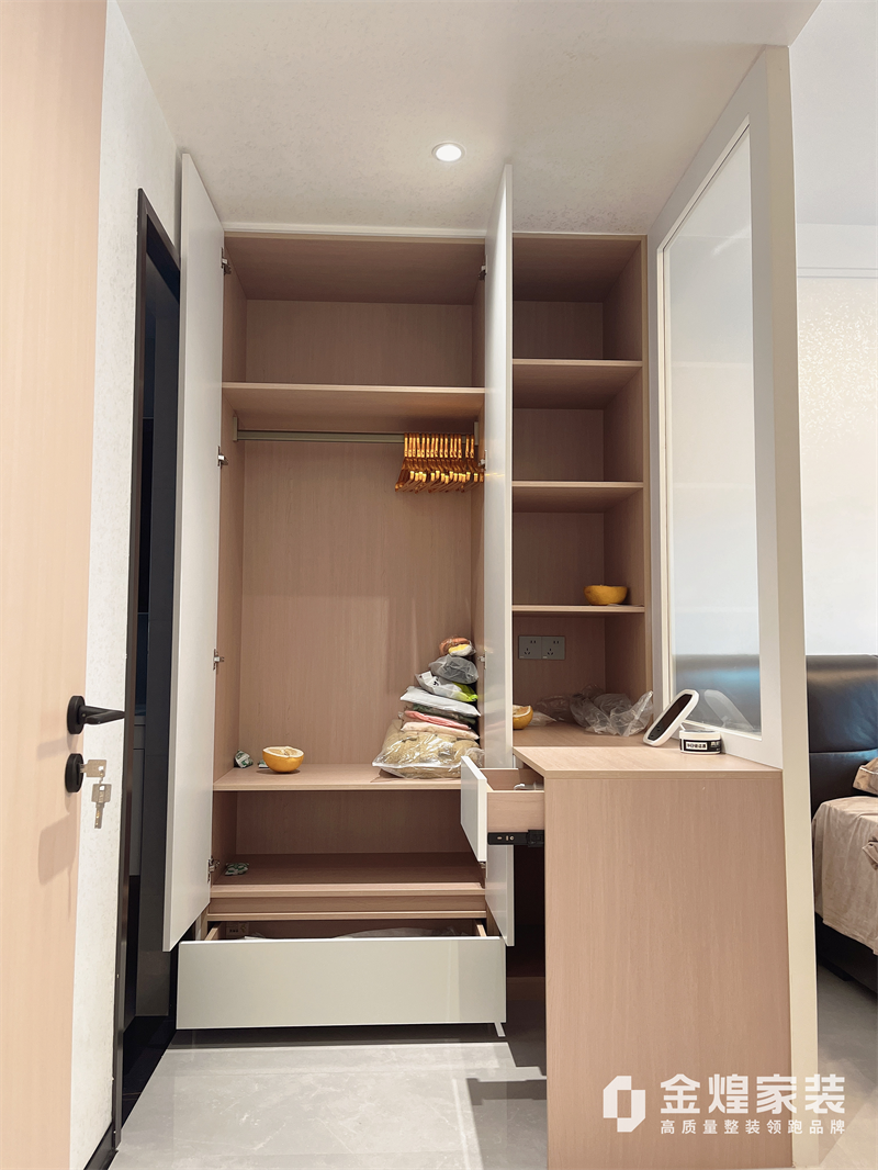 入户门往电梯间推出去了1m,增加了过道面积跟储物空间。整体色调偏暖色,家具选用深色家具让空间更有层次。