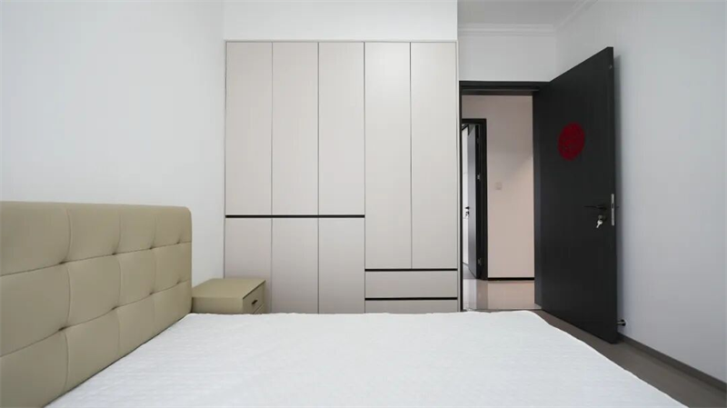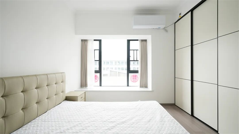 主卧以极简语言诠释静谧与舒适,是喧嚣都市中的一方私密避风港。整体采用低饱和色调,米白墙面搭配浅木色地板,营造出温柔而放松的睡眠氛围。一侧整墙通顶衣柜采用无把手设计,线条利落,收纳强大又不显突兀。小型飘窗台,搭配素雅窗帘,自然光透过纱帘洒入,让清晨的第一缕阳光成为温柔唤醒的仪式。