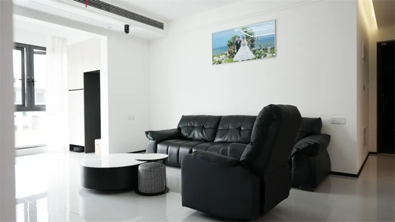 黑色皮质沙发线条流畅,质感高级,搭配圆形大理石茶几与格纹边几,形成现代而舒适的会客区。通透落地窗将自然光引入室内,高光地砖映照出明亮通达的空间氛围,让每一寸光线都成为生活的注脚。墙上一幅婚纱照静静诉说着家的归属与情感记忆,而远处阳台的“囍”字贴纸,则为这份理性之美添上一抹温情的仪式感。