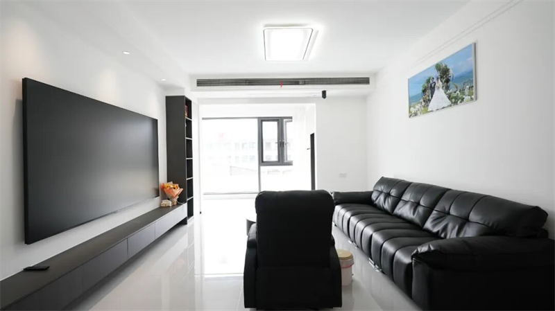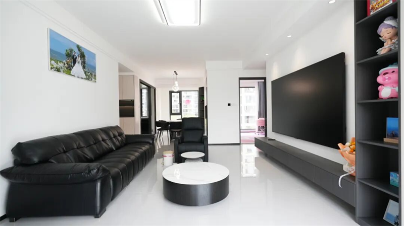 客厅以极简美学为底色,用黑白灰的纯粹配比勾勒出干净利落的空间轮廓。整面墙悬挂的超大尺寸电视,搭配悬浮式深灰色电视柜,营造出视觉上的轻盈与秩序感。一侧嵌入式开放式置物架巧妙融入收纳与展示功能,陈列着温馨小物与趣味摆件,在冷静中注入生活温度。